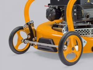 - Косилкой легко управляется благодаря V-образной рулевой колонке, разработанной AS-Motor: левой рукой регулируется скорость от 3,0–4,5 км/ч, когда машина находится в движении. Правой рукой управляют и включают муфту ножа, привод сцепления и предохранительный тормоз. Муфта ножа позволяет остановить лезвие без выключения и перезапуска двигателя, например, при опорожнении травосборника.
