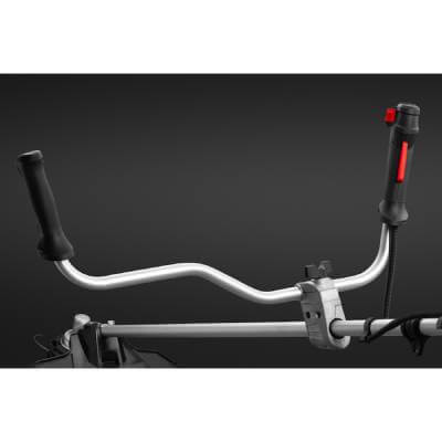 - Бензокоса оснащена эргономичной рукояткой велосипедного типа с системой универсального управления, которая позволяет контролировать число оборотов двигателя и исключает случайное нажатие на курок газа. В экстренных ситуациях имеется возможность моментально заглушить двигатель.