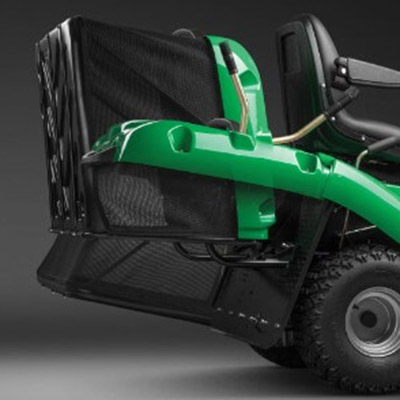 - Машина оборудована объемным травосборником емкостью 380 литров с рычагом подъема.