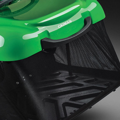 - Машина CAIMAN Comodo MAX 4WD оборудована вместительным травосборником емкостью 380 литров с рычагом подъема.