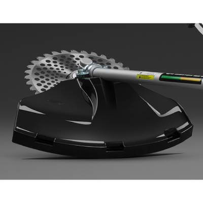 В стандартной комплектации имеется комбинированный защитный кожух со съемным элементом, который подходит как для работы с триммерной насадкой, так и со стальным диском (необходимо отсоединить нижнюю съемную часть кожуха).