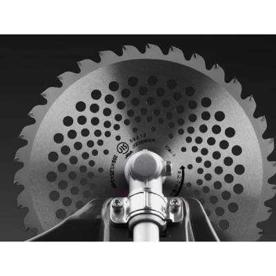 - Инструмент японского производства оснащен диском для среза жесткой растительности и небольших деревьев Katana Blade и триммерной насадкой с леской.