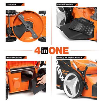 - Функции 4-в-1 (Кошение травы, сбор в травосборник, боковой выброс и мульчирование.)