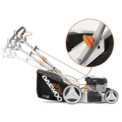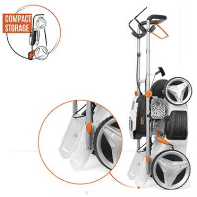 - Современная конструкция двигателя и складная рукоятка позволяют компактно хранить газонокосилку в вертикальном положении.