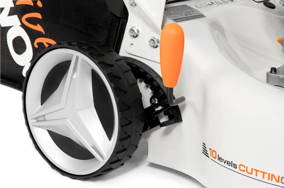 - 10 ступенчатая центральная регулировка высоты кошения от 25 до 75 мм позволяет выбрать оптимальную высоту травы, в зависимости от назначения газона.
