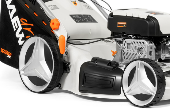 - Переднее диаметром 205 мм, задние — 280 мм позволяют косилке легко работать даже на неровных участках и иметь хорошее сцепление с поверхностью.