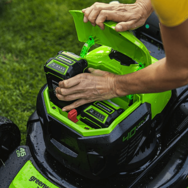 - Газонокосилка имеет один отсек питающего аккумулятора и дополнительный отсек для хранения запасного аккумулятора. Когда основной аккумулятор разряжается, вам не нужно идти за новым — достаточно просто поменять аккумуляторы местами.