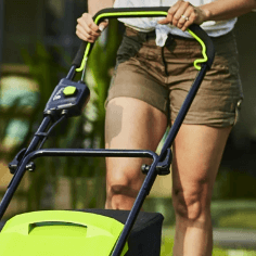 - Для запуска газонокосилки нужно зажать кнопку блокировки и рычаг запуска. После чего двигатель приводит в движение нож, который срезает траву.