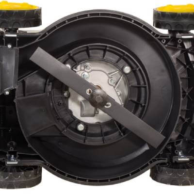 - Ножи закрыты защитным кожухом, что повышает безопасность использования моделью и предотвращает разбрасывание скошенной травы.