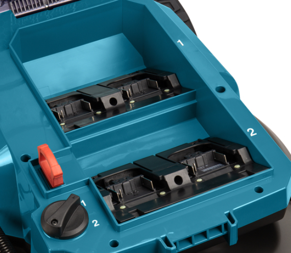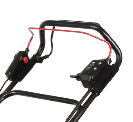 - Бесступенчатое регулирование переменной скорости, изменение работы в зависимости от нагрузки и аккумуляторный отсек на четыре батареи, рекомендуемая площадь скашивания 1900 м².