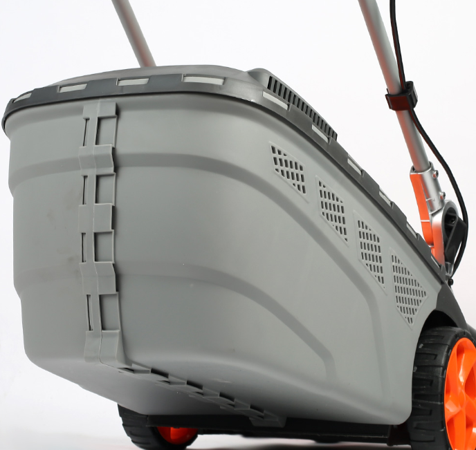 - Долговечный пластиковый травосборник, позволяющий использовать химию для мойки.