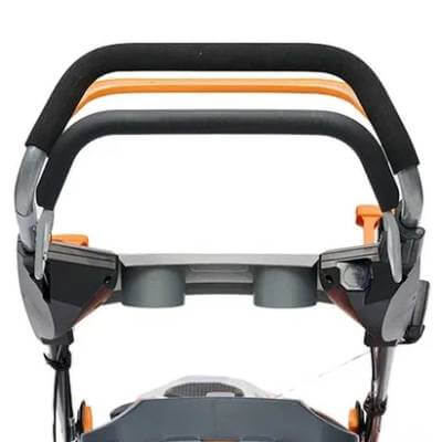- Для удобства хранения рукоятку можно сложить, тем самым уменьшив габаритные размеры газонокосилки. Также имеется нижняя ручка для транспортировки.