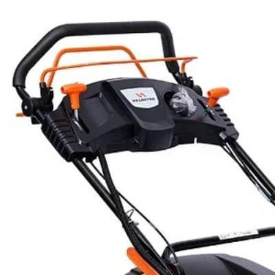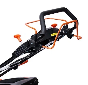 - Рукоятка легко складывается для обеспечения компактности при хранении и удобства транспортировки косилки.